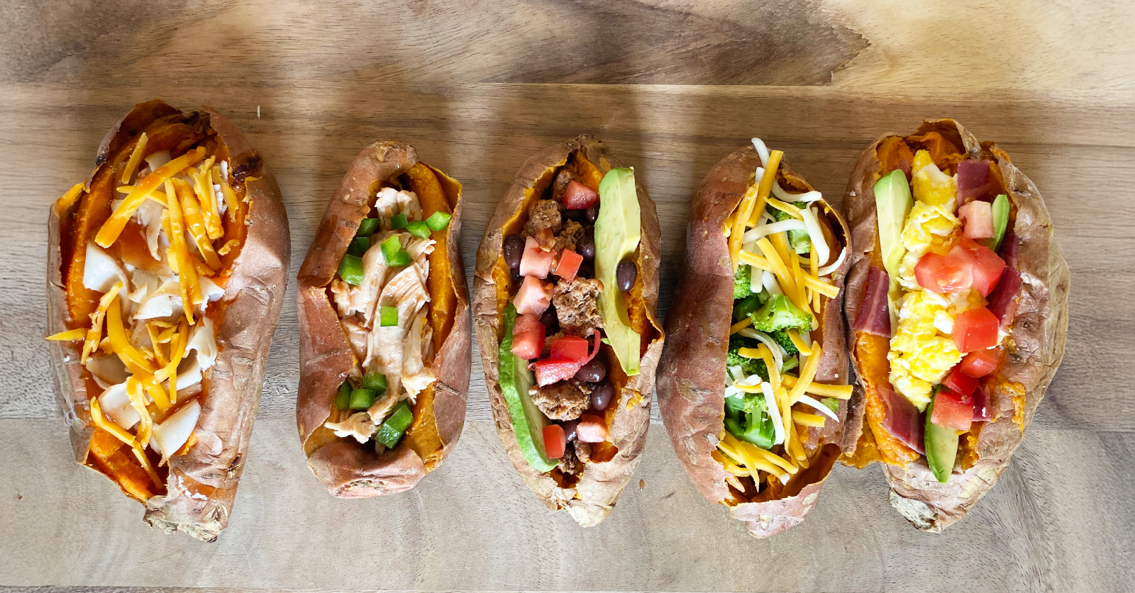 - Baked potatoes with assorted toppings.